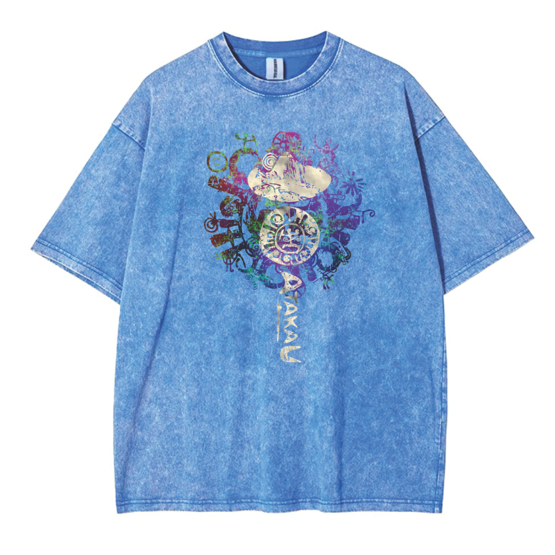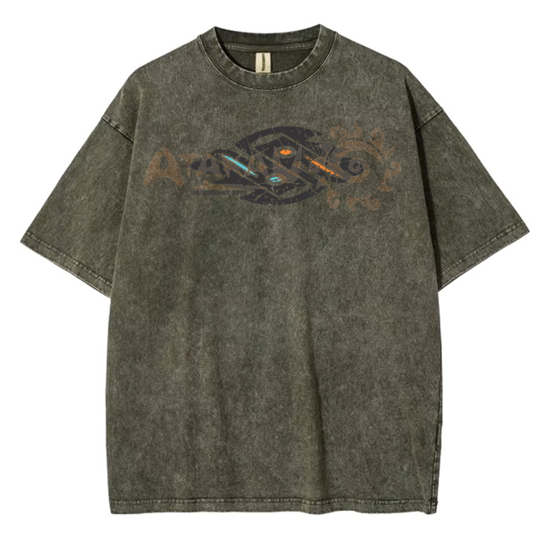 Su diseño frontal combina espirales, tonos cálidos y detalles geométricos con un estilo tribal moderno, evocando las milenarias figuras trazadas en la tierra. En la parte trasera, el logo vertical de ATAKALU refuerza el mensaje de identidad, arte y herencia cultural.